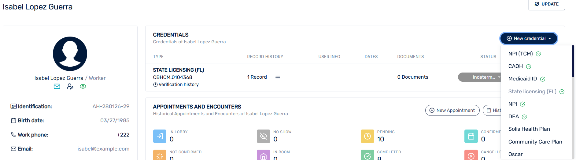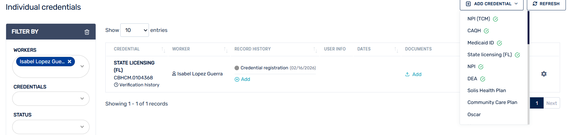It can also be added directly from the Credentials panel > Individual. In the left-side filter, you can search for the worker, and in the upper-right corner, under the Add Credential option, you can add the corresponding credential.